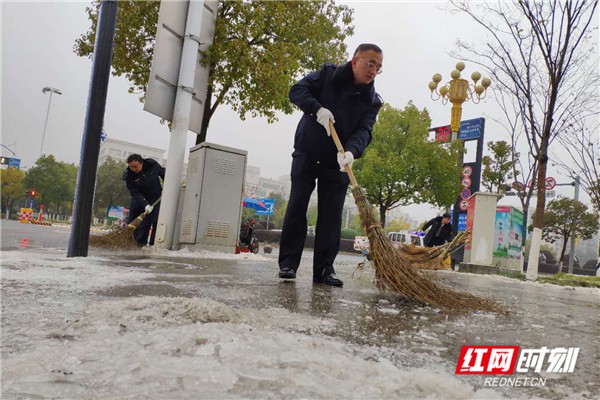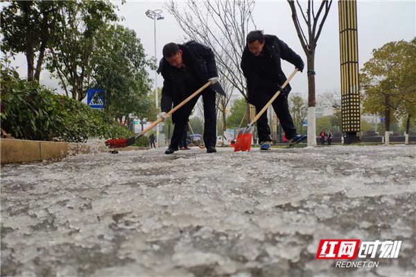 永兴县高亭司镇组织干部进行雨雪天气文明劝导和撒盐除雪,确保群众出行安全。