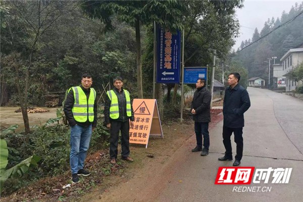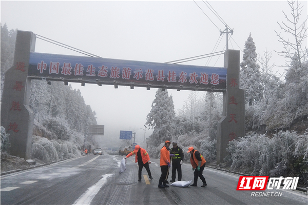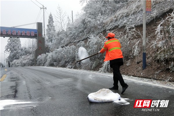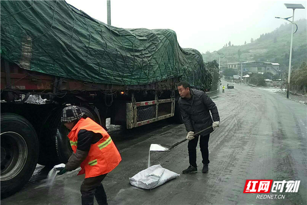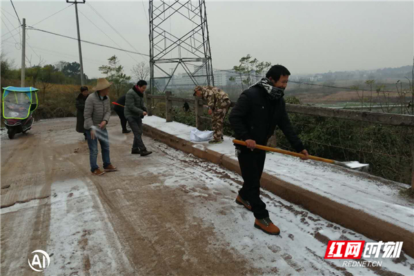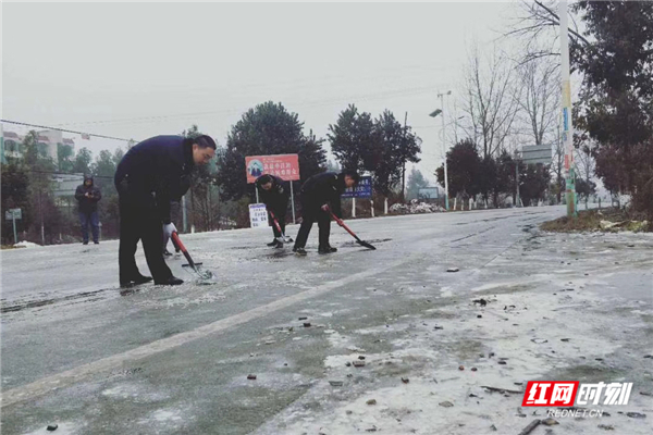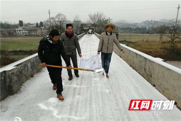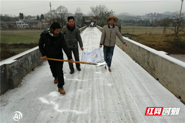 12月31日,桂阳县欧阳海镇组织镇村干部上路撒盐融冰。