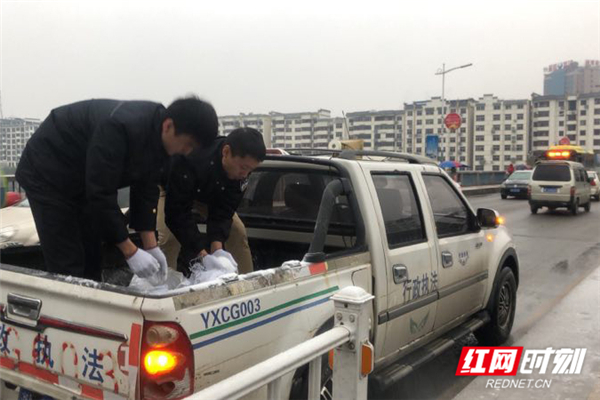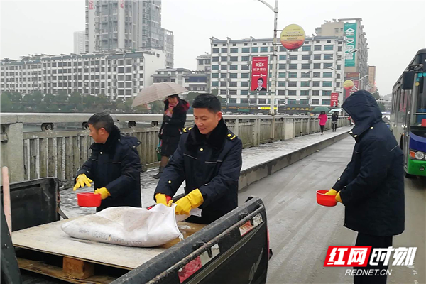 12月31日,永兴城管队伍里上街除冰,在重要交通路口撒盐除冰。