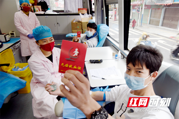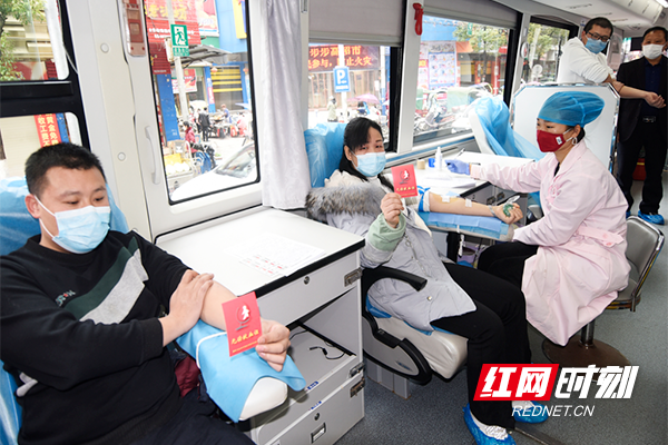 红网时刻2月7日讯 (通讯员 黄春涛 罗永芳 李福珍)2月7日,嘉禾县人民路流动献血站,村民在无偿献血。当日,嘉禾县珠泉镇钟水村共产党员李文仔带领两个儿子、儿媳妇及侄子一起6人来到流动献血站,撸起袖子,用自己的热血为亟待救治的病患送去希望,为抗疫前线的勇士传递奋进力量。