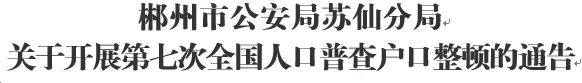 第七次全国人口普查是中国特色社会主义进入新时代开展的重大国情国力调查,是推进国家治理体系和治理能力现代化的重要举措。为确保人口普查工作质量和切实保障广大市民的切身利益,实现户籍信息和公民身份号码的准确性、唯一性、权威性,郴州市公安局苏仙分局决定在全区范围内开展第七次人口普查户口整顿工作。户口整顿期间,工作人员将通过上门、电话或网络等形式,对户籍登记信息进行核对,请予以支持和配合,主动提供真实、准确、完整的信息。如有以下七种情况,应及时向辖区公安机关申请办理: