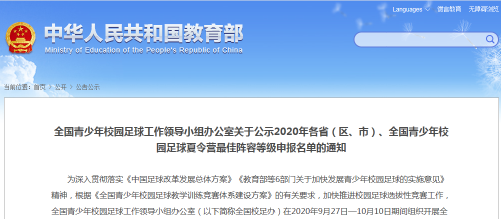 近日,教育部官网发布了《全国青少年校园足球工作领导小组办公室关于公示2020年各省(区、市)、全国青少年校园足球夏令营最佳阵容等级申报名单的通知》。