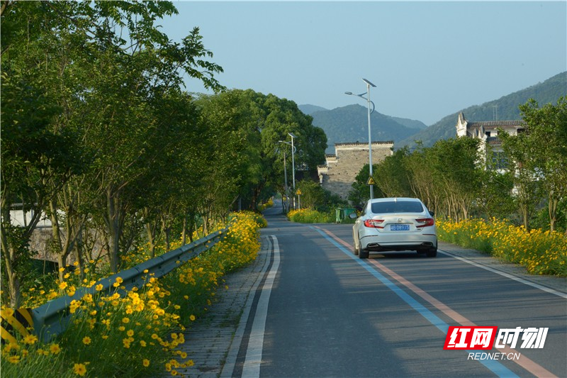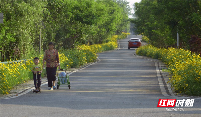 不搞大拆大迁,不搞高大上,在保持原生态面貌的前提下,因地制宜。河堤两岸铺设了柏油道路,沿河两边建设了亲水平台,道路两边栽上紫薇花树、黄槐树、垂柳树、银杏树等,既护堤又生态;人行道上种满格桑花、金黄菊花,既绿化又好看,呈现出了一幅“村在绿中、路在花中、人在园中”的美景。