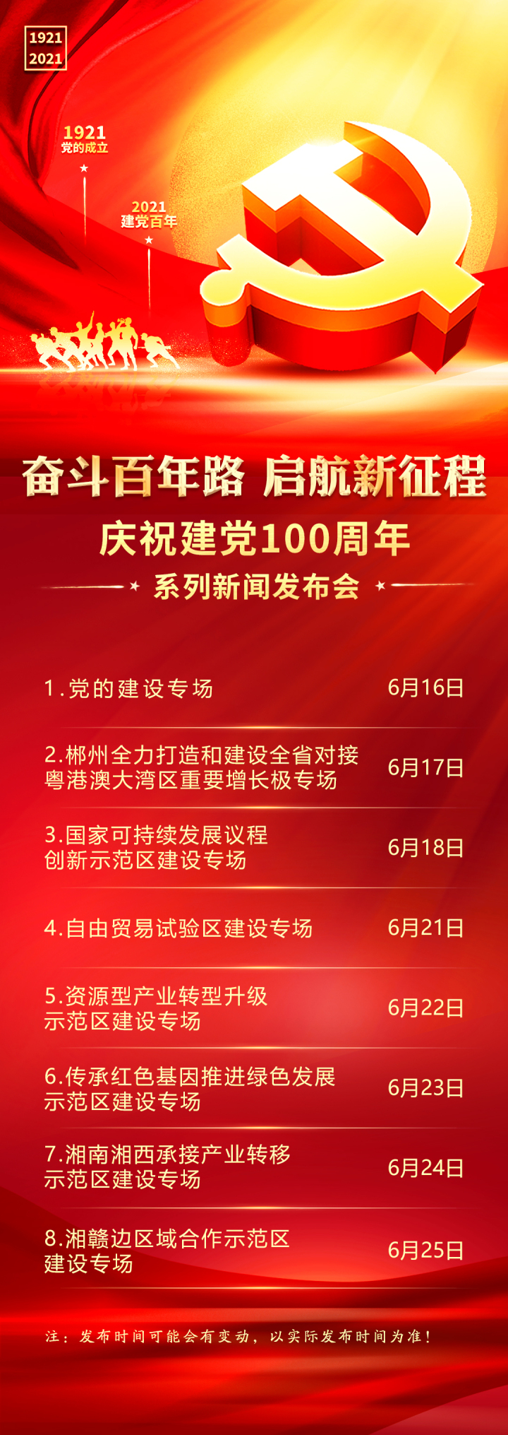 红网时刻6月15日讯 郴州市将于6月16日至25日举行“奋斗百年路 启航新征程”郴州市庆祝中国共产党成立100周年系列新闻发布会,通过8场新闻发布会展示郴州在党的领导下经济社会发展取得的历史性成就。