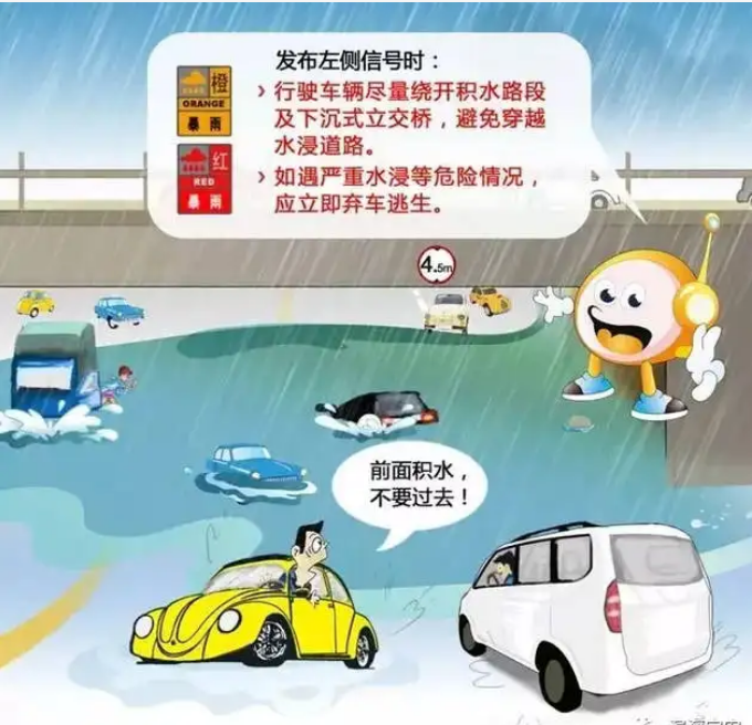 如遇车辆被积水围困,可根据水位采取以下措施。