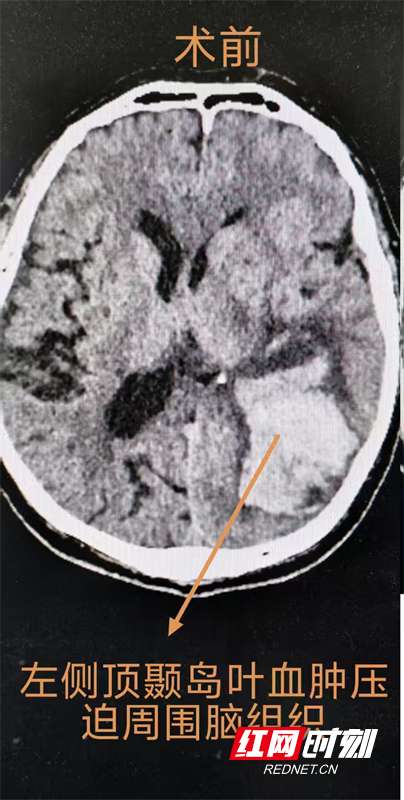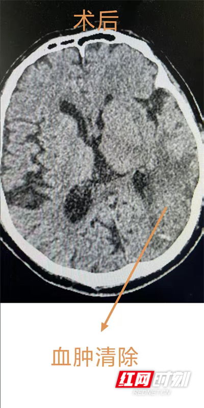 神经外科等科室医生迅速参与会诊,结合患者心脏支架植入后的身体状况,评估认为当前外科手术风险极高,团队一致决定暂时采取保守治疗,将患者转入NICU进行24小时严密监护。由于患者接受了心脏支架手术,需服用抗凝药物防止支架内血栓形成,而抗凝药物又可能导致脑出血继续增加,手术后新发出血可能性很高,主动耐心细致地与患者家属沟通病情及治疗方案,打消他们的顾虑。4天后患者左侧脑内出血量明显增加,可能危及生命,随即启动多学科协作讨论,联合心血管内科、ICU、麻醉科评估手术风险及耐受性,决定采用颅骨钻孔血肿碎吸引流术这一微创术式,精准定位、颅骨钻孔、血肿腔穿刺引流,短短数十分钟,手术取得圆满成功。