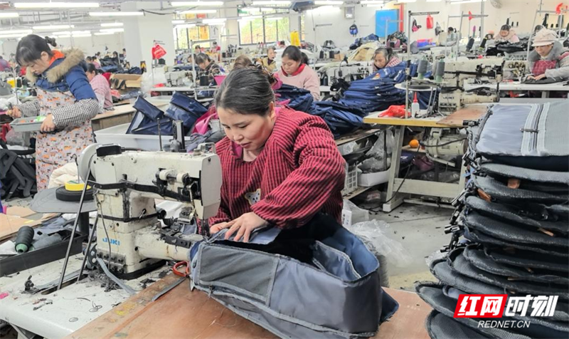沙田镇江湾村,桂东县志圣皮具公司帮扶车间,为脱贫人口、陪读妈妈、白发一族等提供就近就业岗位,全年发放工资总额达480万元,务工者“赚钱、顾家两不误”。