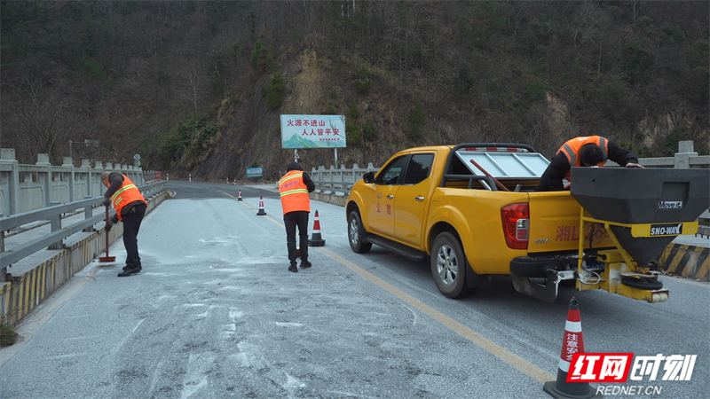 湖南高速公路集团有限公司郴州分公司临武管理所撒布融雪剂。