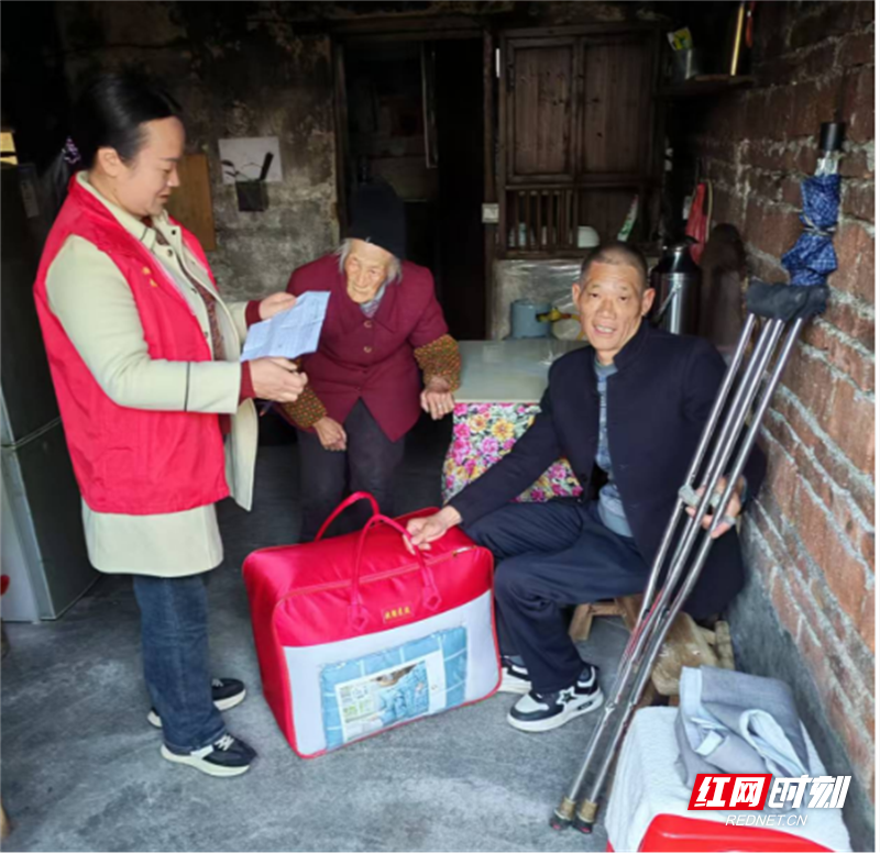 “嫂子,最近气温骤降,我们给您送来了棉被、米油,您安心过冬,一定要注意防寒保暖和饮食安全,有任何困难随时跟村里、乡镇或民政局说。”近日,永兴县民政局局长冯爱惠来到困难群众家中,将慰问物资送到大婶手中,话语间满是关切。大婶紧紧握住冯爱惠的手,感动地说:“太感谢你们了,一直把我们困难群众放在心上!”