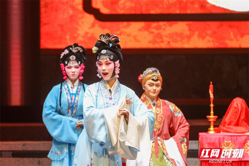 当晚的演出还通过多个媒体平台同步直播。这群平均年龄不足20岁的青年演员身着华美戏服,以精湛的演技和动人的唱腔,将花鼓戏的独特韵味演绎得淋漓尽致。每一个动作、每一句唱词都饱含深情,深深打动了观众,现场掌声与喝彩声不时响起,直播平台上好评如潮。