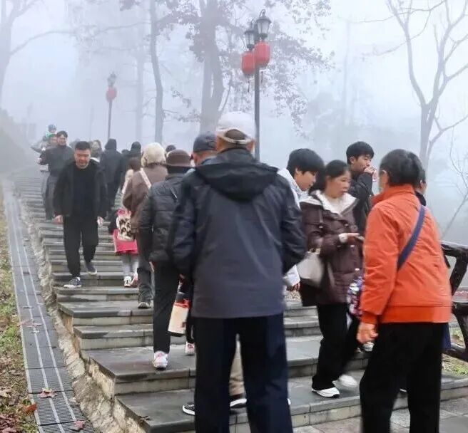 市民扶老携幼踏着石阶稳步而上