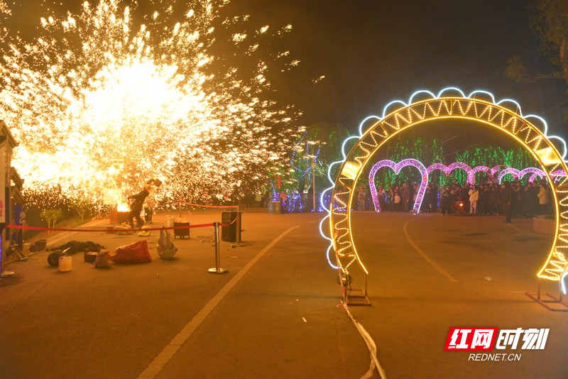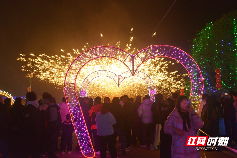 游客们在尽情观看树林中白鹭欢舞的表演、欣赏湘南民居村庄的风采、采摘四季飘香瓜果的体验、在绿树簇拥的游道上漫步的舒畅后。夜幕降临,游客们兴高采烈共赴一场流光溢彩的光影之约,沉浸式感受欢度春节的喜庆氛围与农耕文化交融的独特魅力。航天城的火箭在星光闪烁的夜空腾飞;灯光映照的摇摆桥上一步三晃乐悠悠;彩灯门编织的长廊如星河般神奇醉人。还有篝火晚会、非遗打铁花、火壶表演等节目精彩缤呈,让广大游客们拍手叫好,流连忘返。
