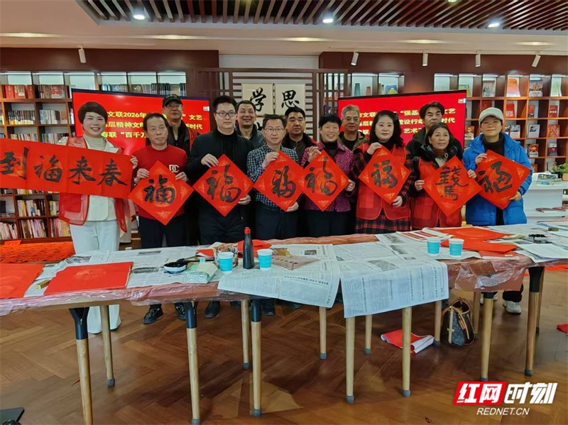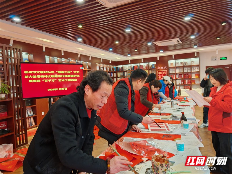 红网时刻新闻2月4日郴州讯(通讯员 罗小英)文艺赋能强根基,文化惠民暖人心。2月4日上午,郴州高速公路出口处年味浓郁、暖意涌动,2026年郴州市“强基工程”文艺助力基层精神文明建设行动暨新时代新春联“百千万”艺术工程文艺惠民活动在此火热进行 。这场由市委宣传部指导,市文联、市文明办、湖南日报社郴州分社联合主办的活动,以群众精神文化需求为导向,架起文艺与基层的桥梁,让文化馨香浸润百姓生活。