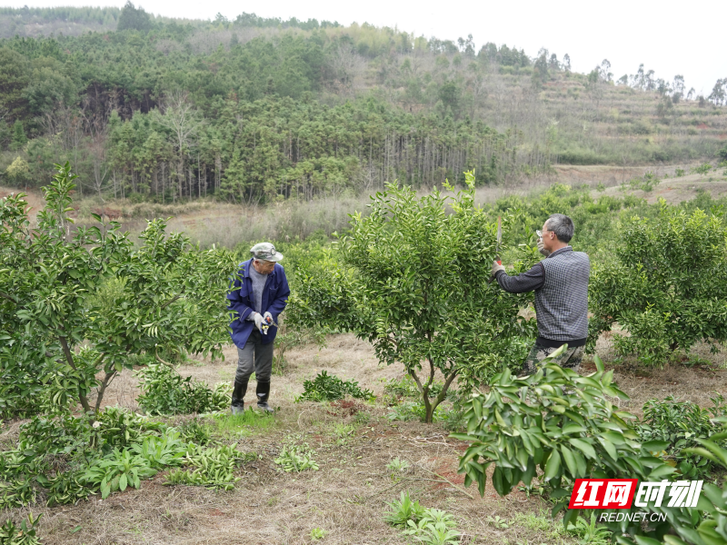 嘉禾县普满乡板贝村,三汇生态农庄的山坡上,三名工人手持剪刀,为柚子树修剪枝条。剪下的枝干和树叶,被小心翼翼地收集起来。