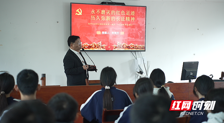 活动首站走进小埠村新时代文明实践站。学校思政课教师许贤方跳出传统课堂,以郴州本地红色史实为切入点,用鲜活的本土英烈事迹拆解长征精神的时代内涵,为学子们带来一堂“接地气”的现场思政课,拉近了青年学生与革命历史的距离。“原来当年的红军也曾走过我脚下的这片土地,英雄其实离我们并不远。”学生余智文在课后深有感触地说。