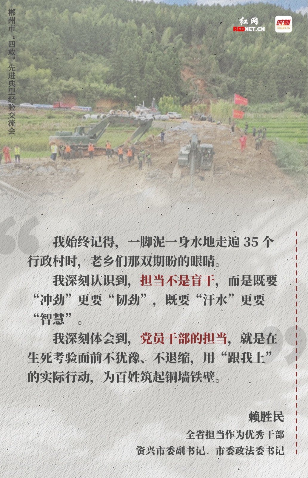 2026年春天,4月7日,郴州市召开“四敢”先进典型经验交流会议,“西老革”挂职干部、全省担当作为优秀干部、“四敢”先进典型代表分别发言,以“四敢”精神催人奋进。