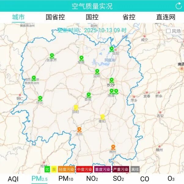 10月13日上午8时(左)、9时(右)湖南省各市州空气质量监测站点PM2.5小时浓度