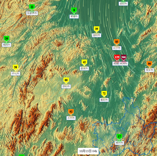 10月13日4时湖南省各市州PM2.5小时浓度(左)10月13日8时湖南省各市州PM2.5小时浓度(右)