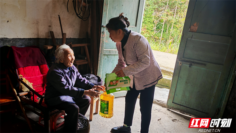 流源村的石下组邓春秀,今年97岁,儿子相继去世,眼睛也慢慢看不见,现在只能靠孙子偶尔回来探望。片区组长陈冬华,几乎每周都要走路去一趟,有时候拿着自己做的饺子,有时候拿着青菜,油、米、面。