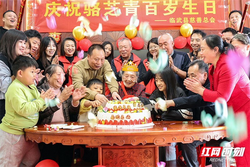 10月25日,临武县慈善总会志愿者给武水镇邝家村101岁的骆芝青送去了蛋糕和慰问品,庆贺老人寿辰。