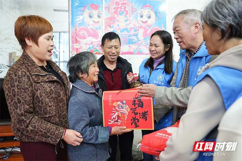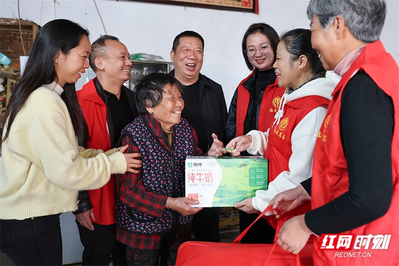 在舜峰镇沐塘村,志愿者为空巢老人邝爱莲送去了爱心大礼包。