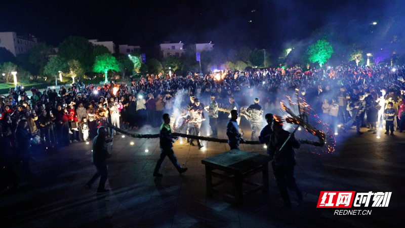 伴随着人群爆发出阵阵欢呼,专业舞龙队伍手持流光溢彩的畲族香火龙震撼登场,两条独具特色的香火龙在广场灵活穿梭、盘旋腾跃,与温泉小镇的夜色交相辉映。最后,民族风情的文艺汇演更是将现场气氛推向全新高潮。一个个精彩节目生动展现出汝城的山水秀丽之美与浓郁的畲族民族风情,赢得了台下观众的阵阵掌声与喝彩。“这个畲族民俗文化,以前没看过,今天晚上的表演非常好,以后我们会经常来。”广州游客曾强说道。