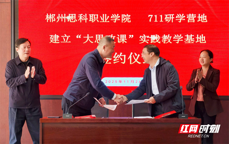 红网时刻新闻11月29日郴州讯(通讯员 胡海)11月26日,郴州思科职业学院与七一一研学营地正式举行“大思政课”实践教学基地签约暨揭牌仪式,标志着郴州本土思政教育资源与学校教育教学体系深度融合迈出关键一步。