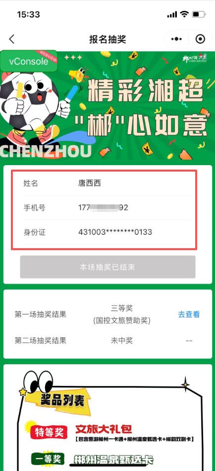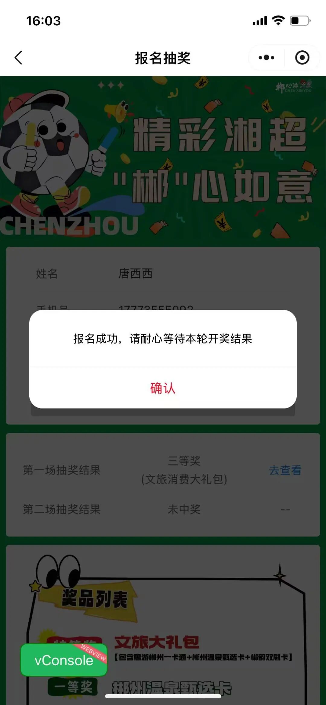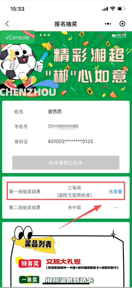 开奖后,打开微信【郴心游】小程序;进入活动专页面,即可查看自己是否中奖、中奖奖项及奖品详情。