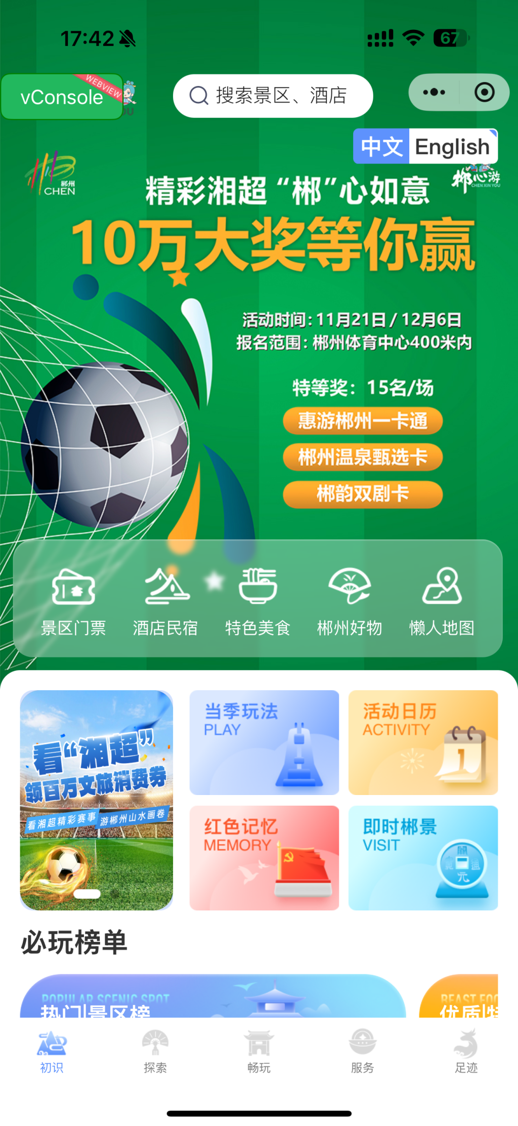温馨提示:如果您在场馆内没有扫描报名二维码,您还可以通过微信搜索栏【郴心游】,进入小程序;在首页找到 “湘超” 活动专区入口,点击专题页面进行报名。