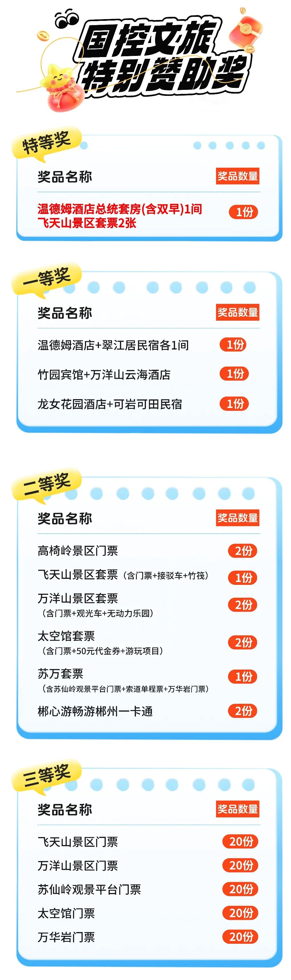 11月21日,湘超郴州主场将热血开赛,总价值10万的文旅大礼已备好!不管是价值7124元温德姆总统套房体验,还是文旅大礼包,跟着这份指南操作,就能轻松参与抽奖、解锁福利,把郴州的美景与惬意带回家~