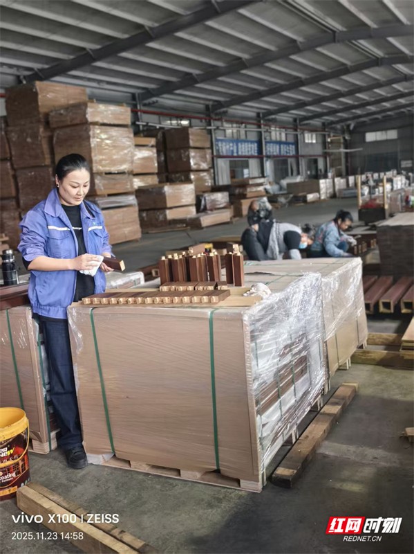 市场层面,杨赛花将工作重心放在国内市场开拓与产品销售上。她通过电话、微信等方式与工厂实时沟通生产进度,精准对接客户需求;针对户外建材、园林景观等细分领域,推出耐高温、耐吸水、不变形的户外重竹防腐竹地板及户外用材,产品凭借优异性能逐步打开市场。技术与市场的双重发力,让企业成功获评国家高新技术企业、湖南省专精特新“小巨人”企业,从地方小厂成长为省市龙头企业。