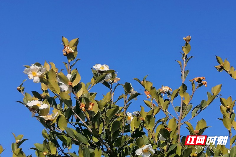 红网时刻新闻11月30日郴州讯(通讯员 李铁南 袁勇杰 曹俊芳)11月30日,资兴市唐洞街道油茶林基地的油茶花如霜雪铺枝,迎来盛花期。连绵山峦间,油茶花竞相绽放,如雪似玉,蔚为壮观。