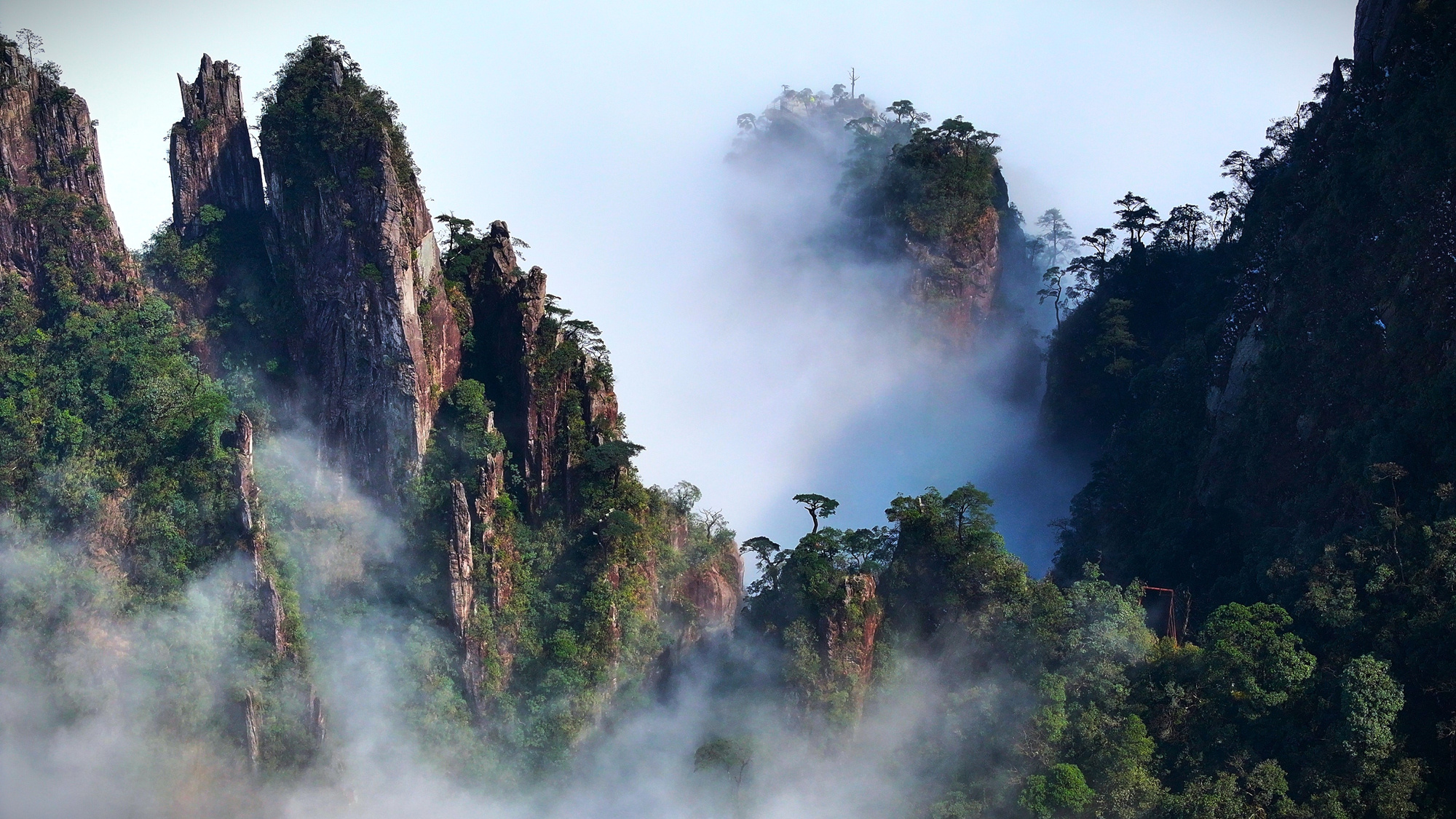 站在海拔1902米的猛坑石主峰俯瞰,万顷林海翻涌绿浪。