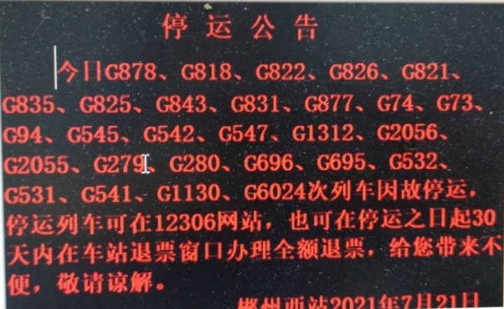 停运的28趟列车分别是:G878、G818、G822、G826、G821、G835、G825、G843、G831、G877、G74、G73、G94、G545、G542、G547、G1312、G2056、G2055、G279、G280、G696、G695、G532、G531、G541、G1130、G6024。
